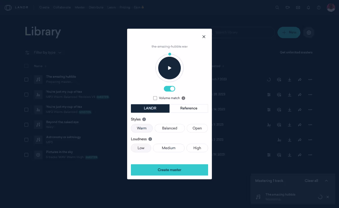 Get 60+ pro-grade plugins, 3 million samples, stem separation, vocal editing and AI mastering. Release unlimited tracks to 150+ platforms with LANDR and keep full control of your catalog and royalties.